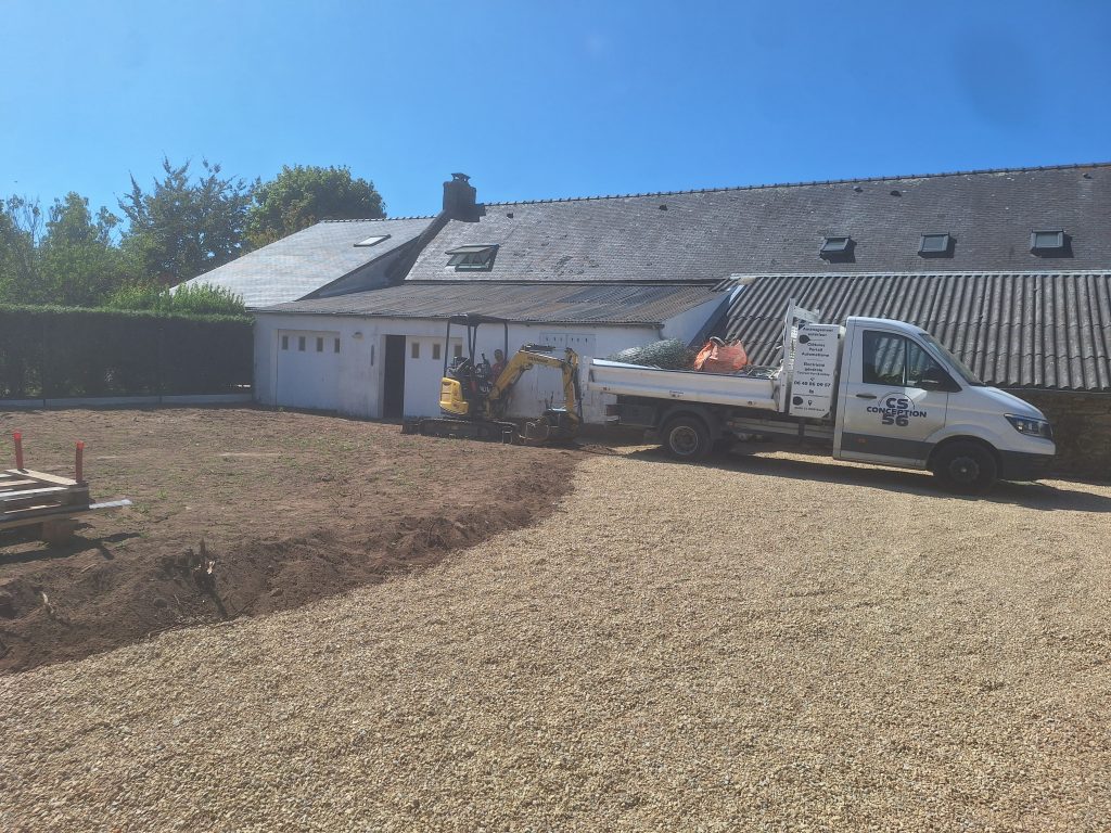 Préparation de terrain et Gros Œuvre Paysager CS Conception 56 assure la solidité de vos projets grâce au décapage des terres et à la réalisation de gros œuvre paysager. Nous coulons vos fondations, longrines et dalles béton pour accueillir durablement vos terrasses, clôtures et zones de stationnement.
